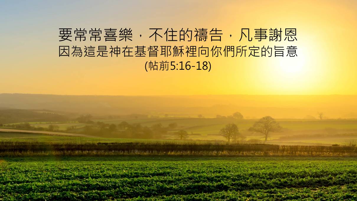 “要常常喜乐;不住的祷告;凡事谢恩;因为这是神在基督耶稣里向你们所定的的旨意。”(帖前5:16-18)